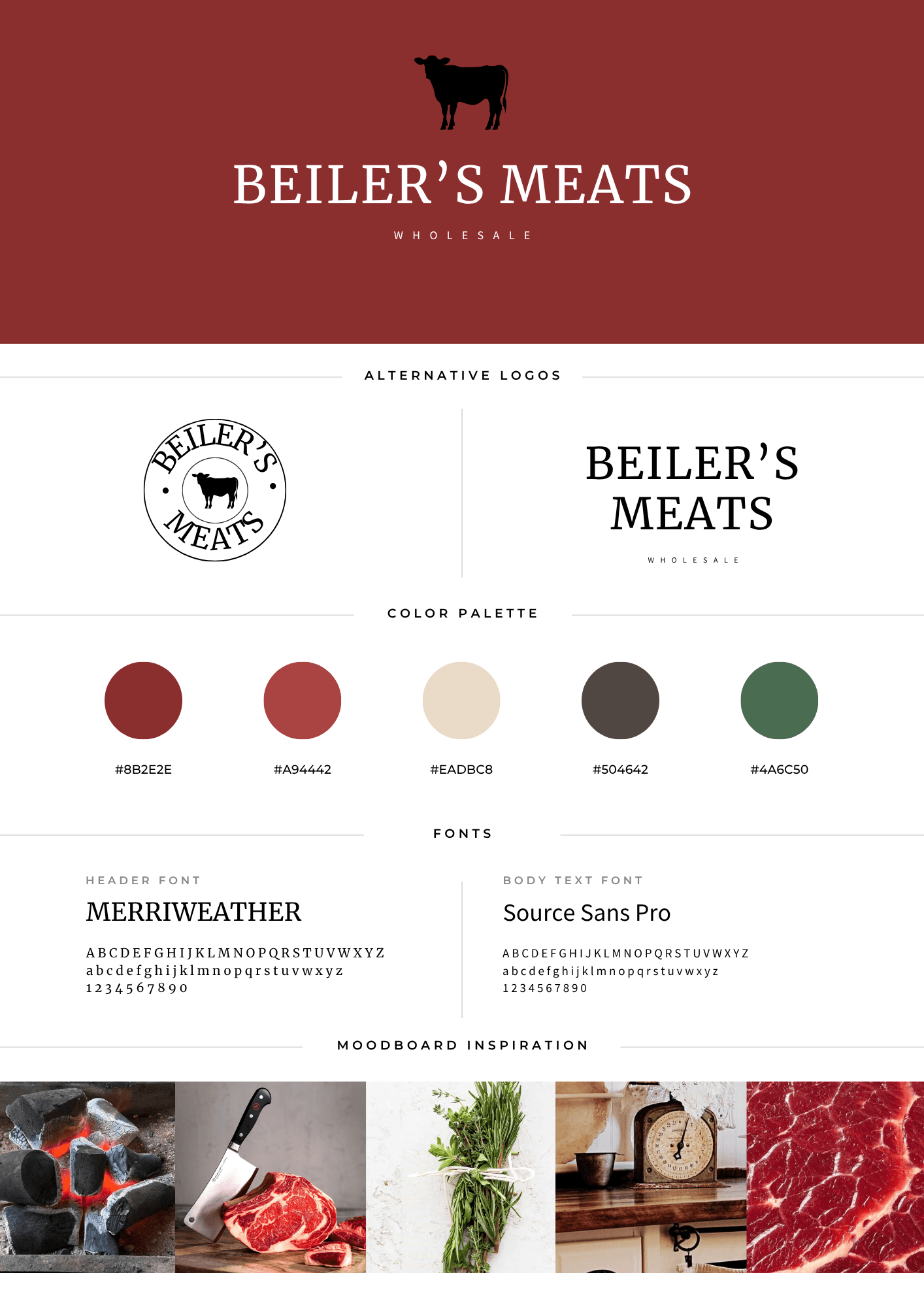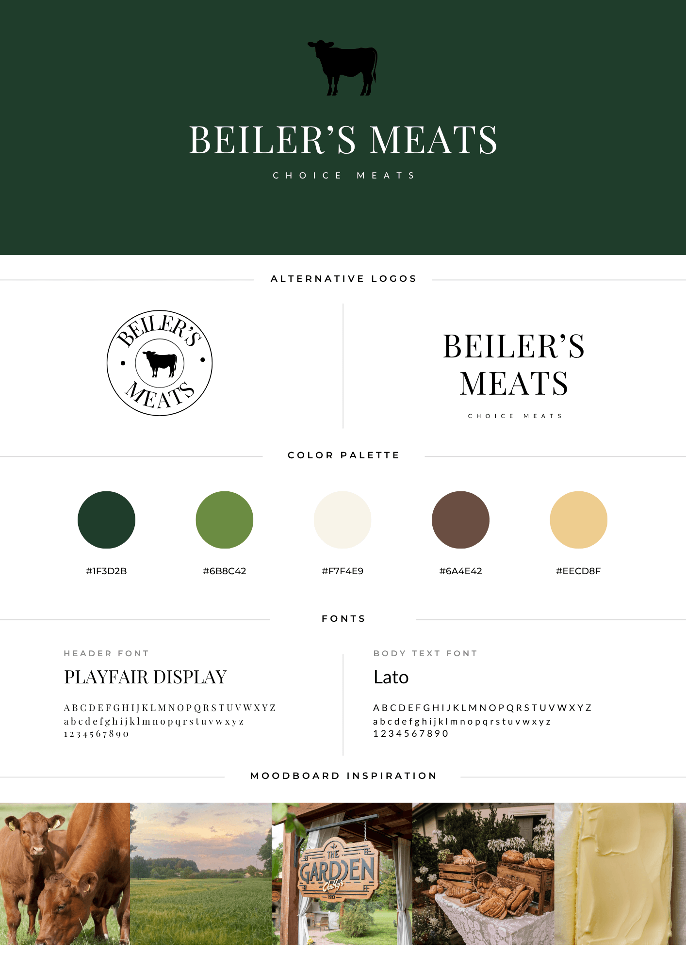 These moodboards illustrate the two sides of Beiler’s brand: the public shop expressed in green with the leading font being Playfair Display showing warm, welcoming, and rooted in tradition. The wholesale identity shifts to red and Merriweather font that invokes a steady, dependable, and built for the pace of real production. Together, they form a unified system that honors the heart of Beiler’s: The Cow.