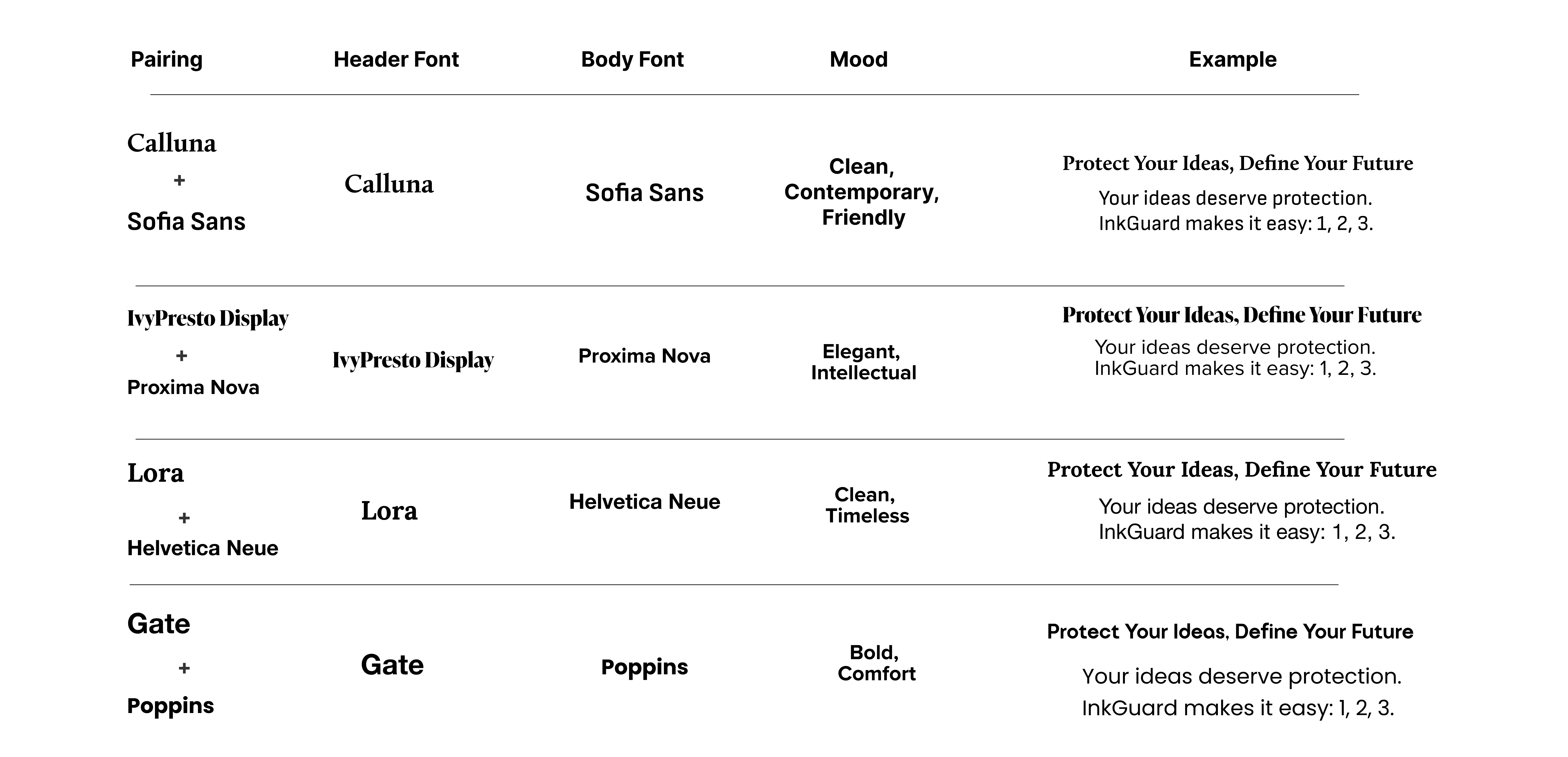 InkGuard’s typography brings structure without feeling intimidating. Gate adds a sense of weight and trust, while Poppins keeps the experience clear, friendly, and easy to move through. Multiple font pairings were tested to find a balance that felt both supportive and dependable, reflecting InkGuard’s goal of protecting ideas without putting distance between creators and the process.
