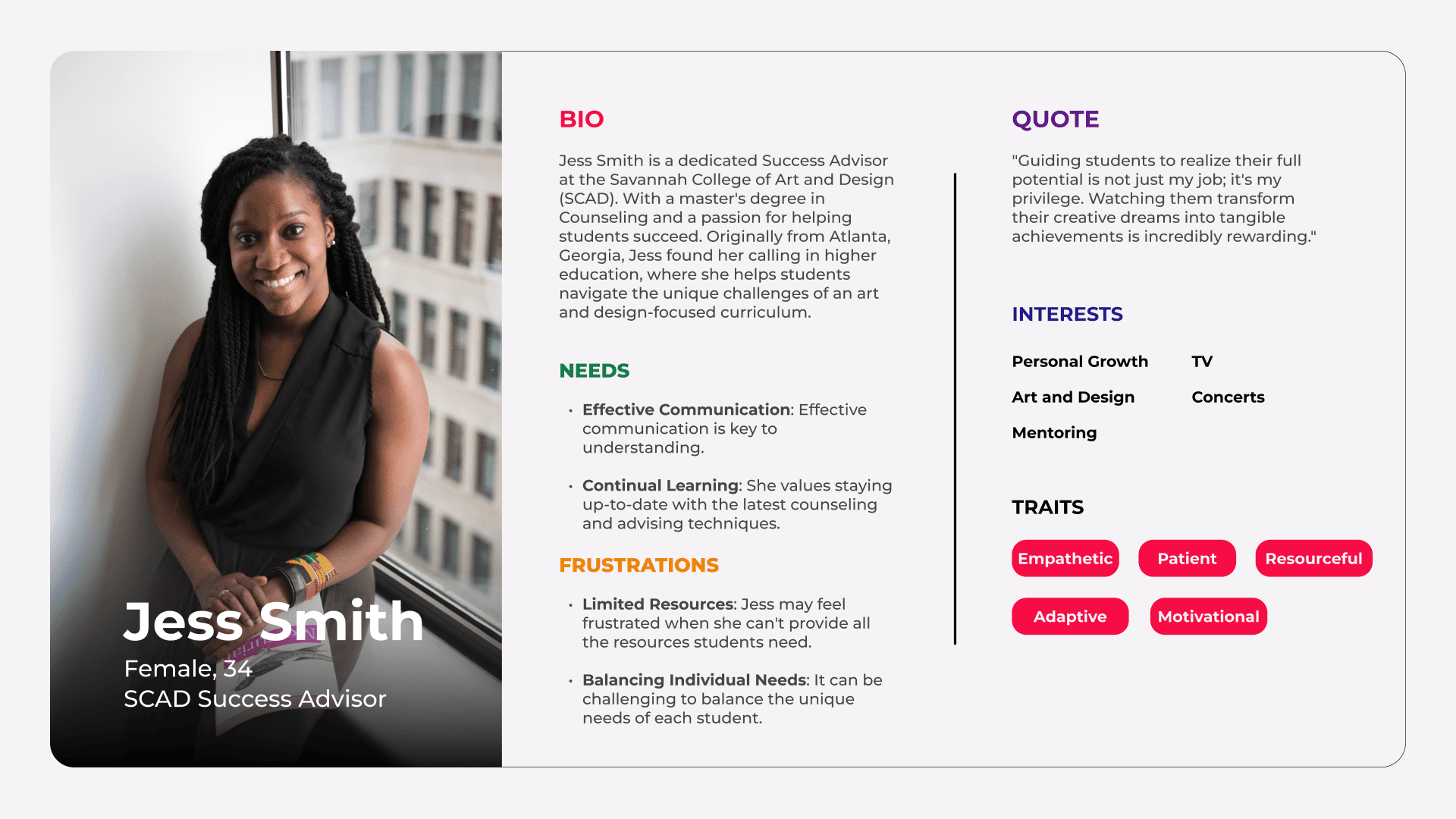 Jess is a Success Advisor at SCAD, dedicated to understanding and addressing the needs of students.